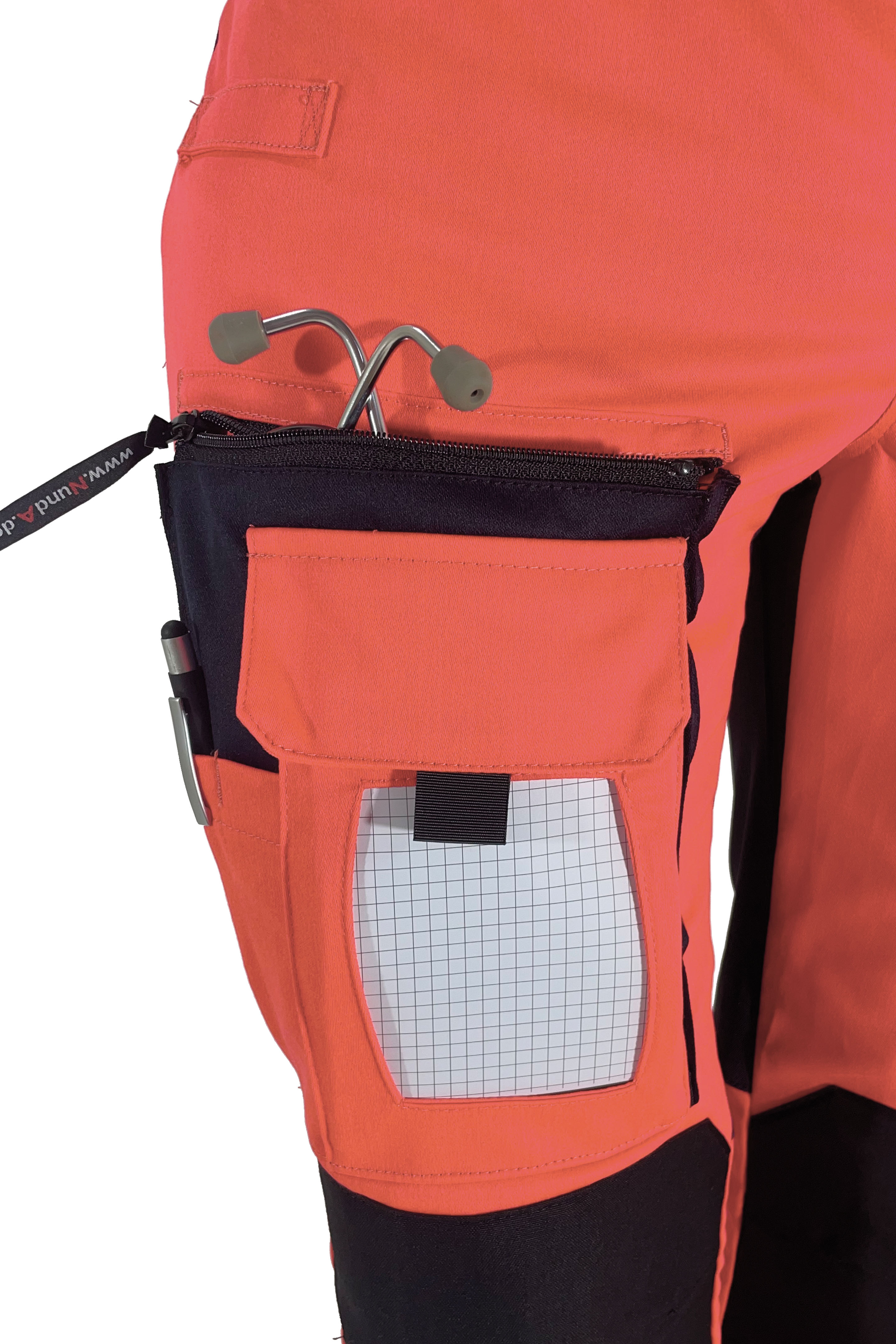 Multifunktions Beintaschen: Linker Oberschenkel seitlich: 3-fach Kombi-Beintasche für Stethoskop geeignet | untere Tasche mit Reißverschluss und Innenliegender Handytasche | darauf 2 aufgesetzte Multitool-Taschen mit Patte und Klettverschluss Rechter vorderer Oberschenkel: Kombi-Beintasche mit Reißverschluss, darauf aufgesetzte Blocktasche mit offenem Sichtfenster und Patte (Einschub für Schreibblock) daneben noch 2 Stiftfächer