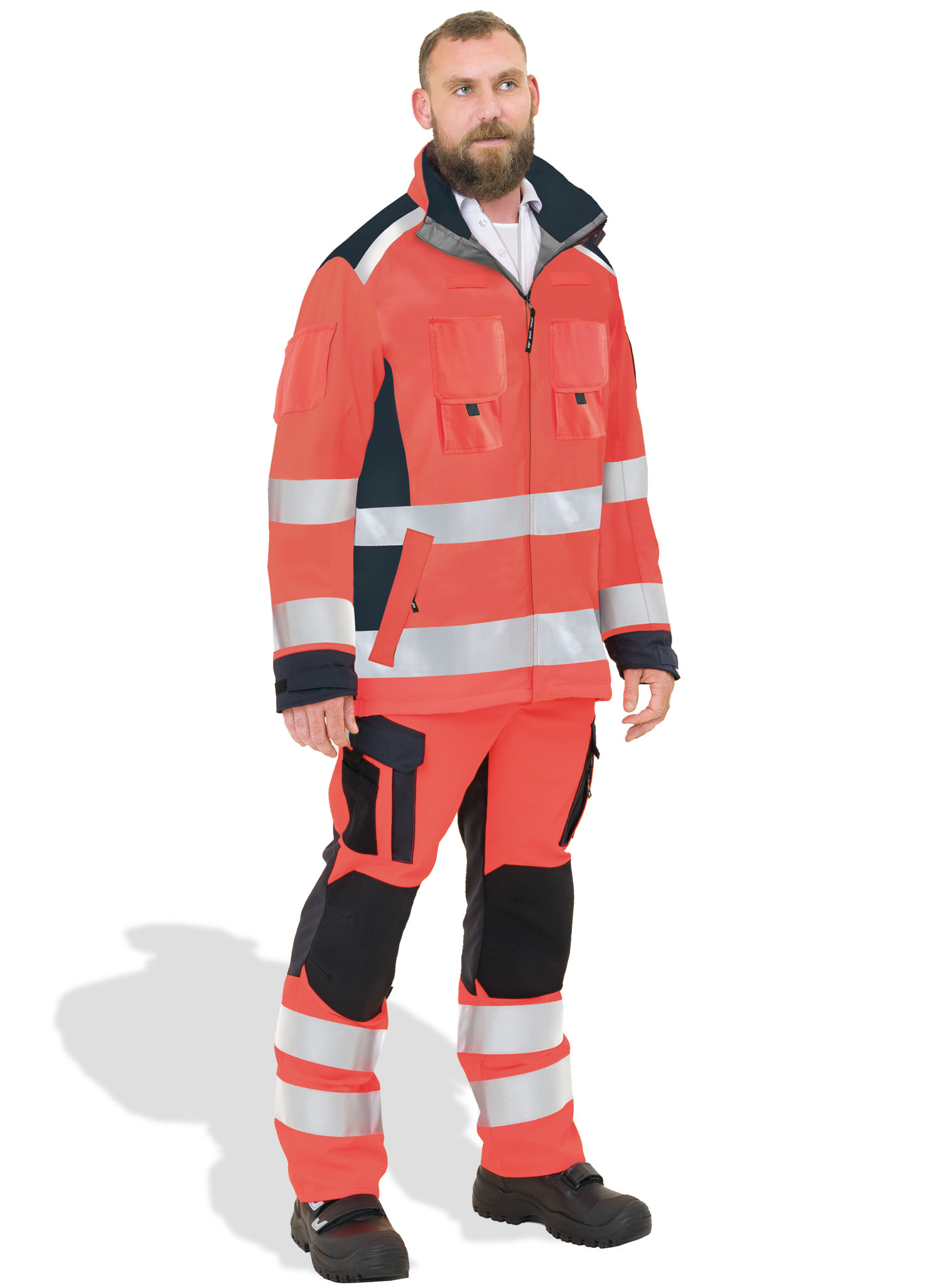 Warnschutz: EN 20471 Klasse 3 (Größen kleiner XS dann Klasse 2 – mit Einsatzhose Klasse 1 als Anzug dann Klasse 3 in allen Größen) Wetterschutz: EN 343 Klasse 4 Wasserdichtigkeit | DGUV-R 105-003 | EN 13758 UV SchutzObermaterial