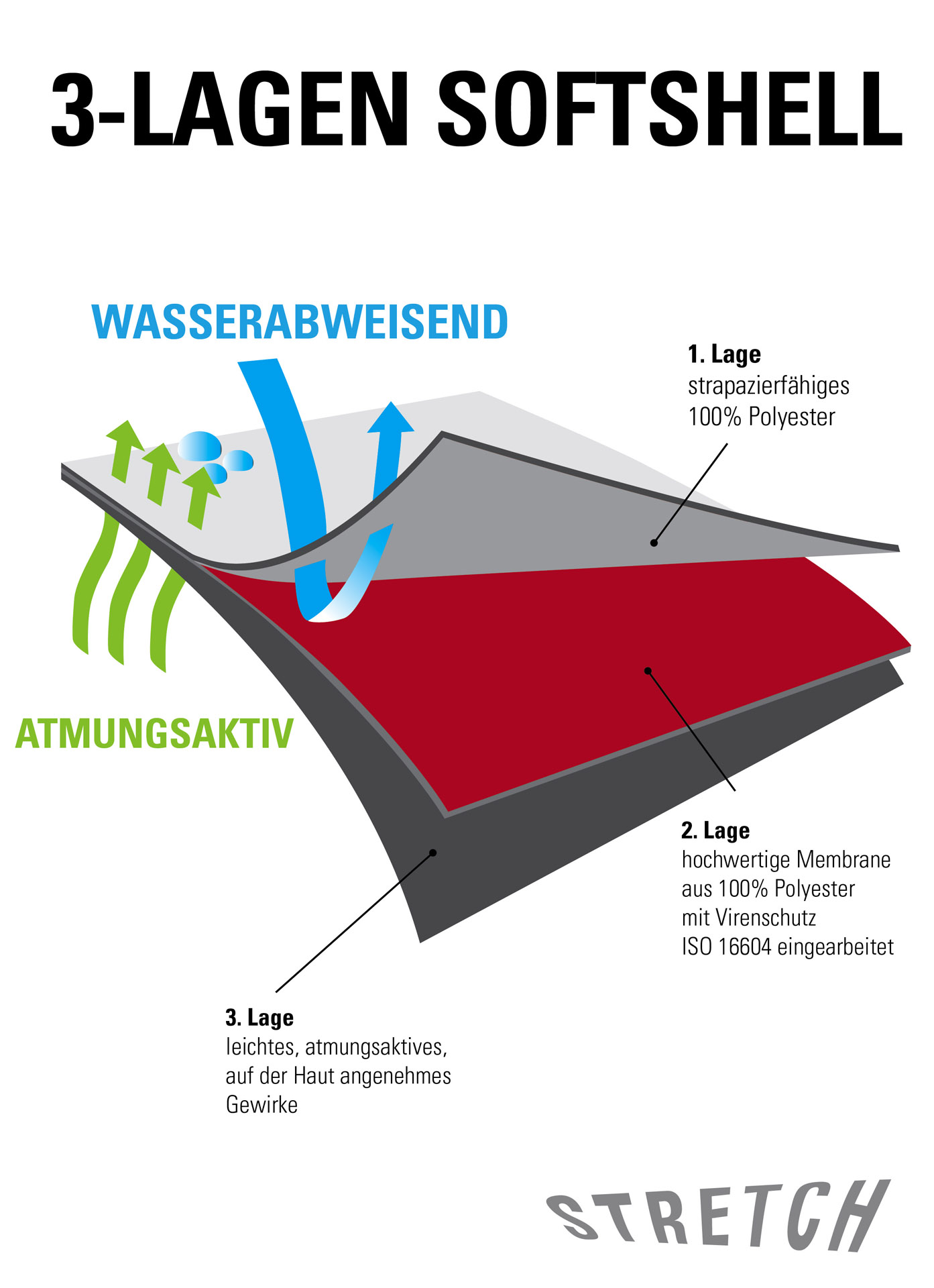 Hochelastisches 3 Lagenlaminat 100% Polyester | Zwischen Aussen- und Innengewirke hochwertige Membrane aus 100% Polyester mit Virenschutz ISO 16604 eingearbeitet | Reflexmaterial