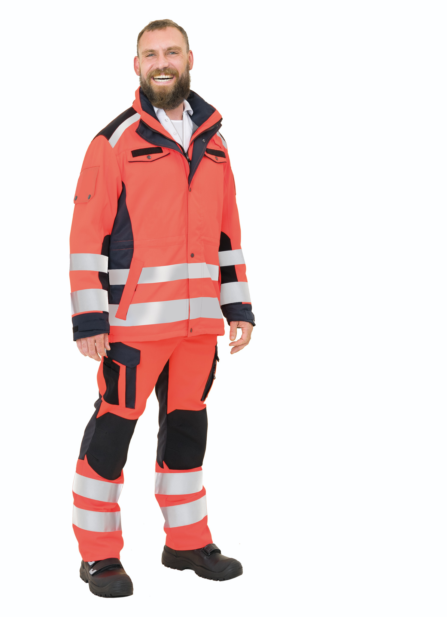 Warnschutz: EN 20471 Klasse 3 (Größe kleiner XS dann Klasse 2 – mit Einsatzhose Klasse 1 als Anzug dann Klasse 3 in allen Größen) Wetterschutz: EN 343 Klasse 4 Wasserdichtigkeit | DGUV-R 105-003 | EN 13758 UV Schutz