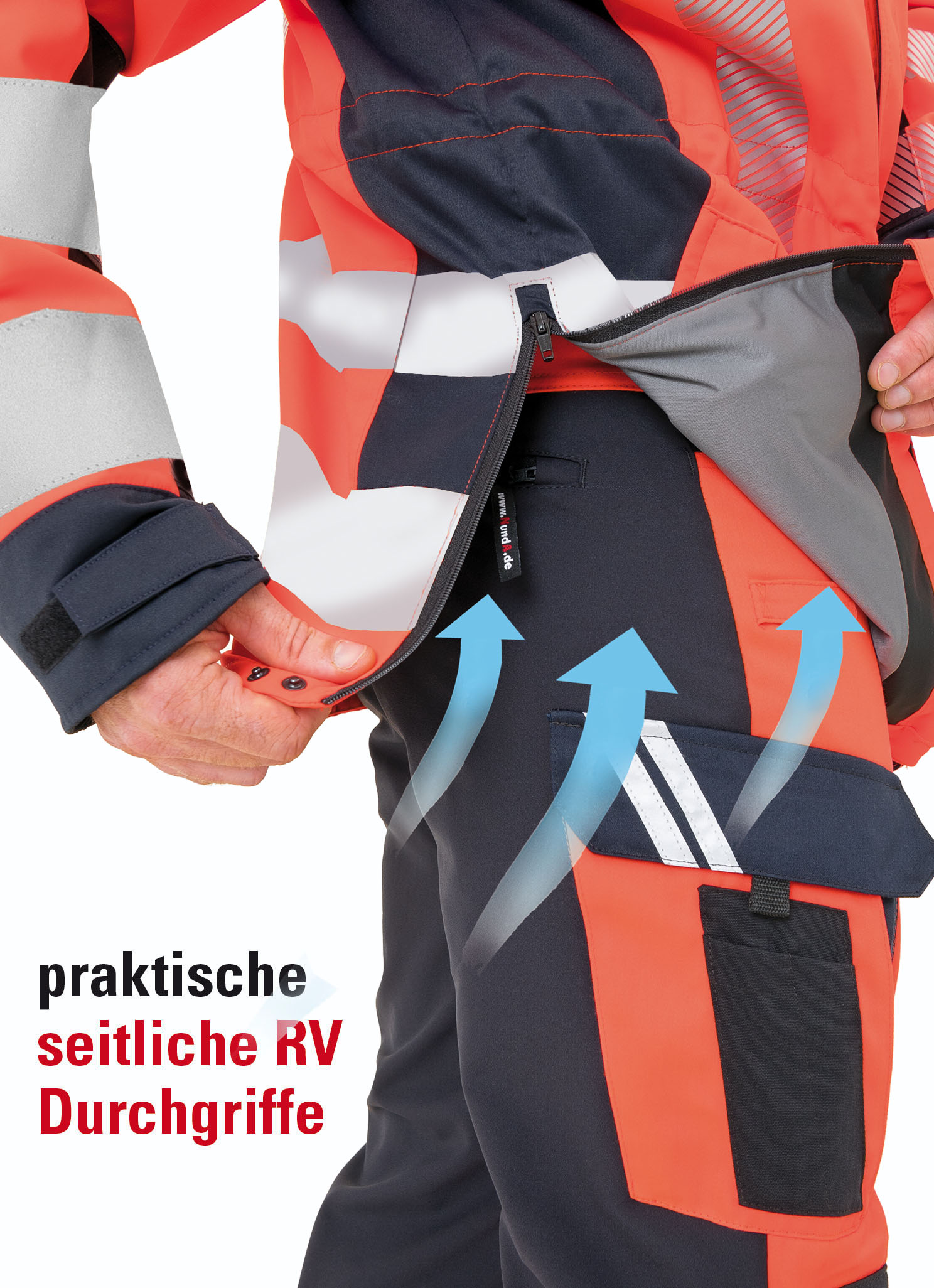 • Seitliche Durchgriffe am Bund mit Reißverschluss