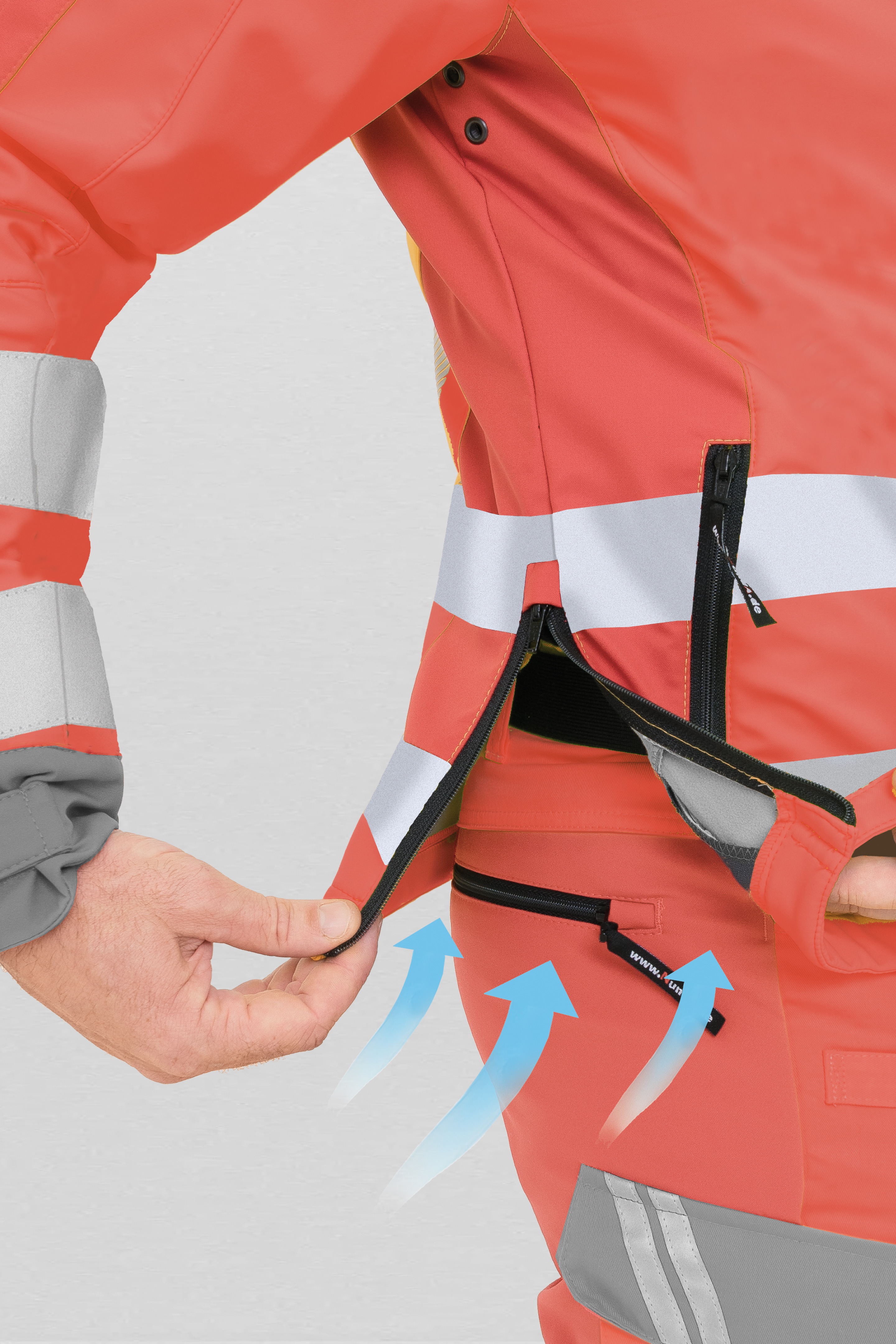 Warnschutz: EN 20471 Klasse 3 (Größe kleiner L dann Klasse 2 – mit Einsatzhose Klasse 1 als Anzug dann Klasse 3 in allen Größen