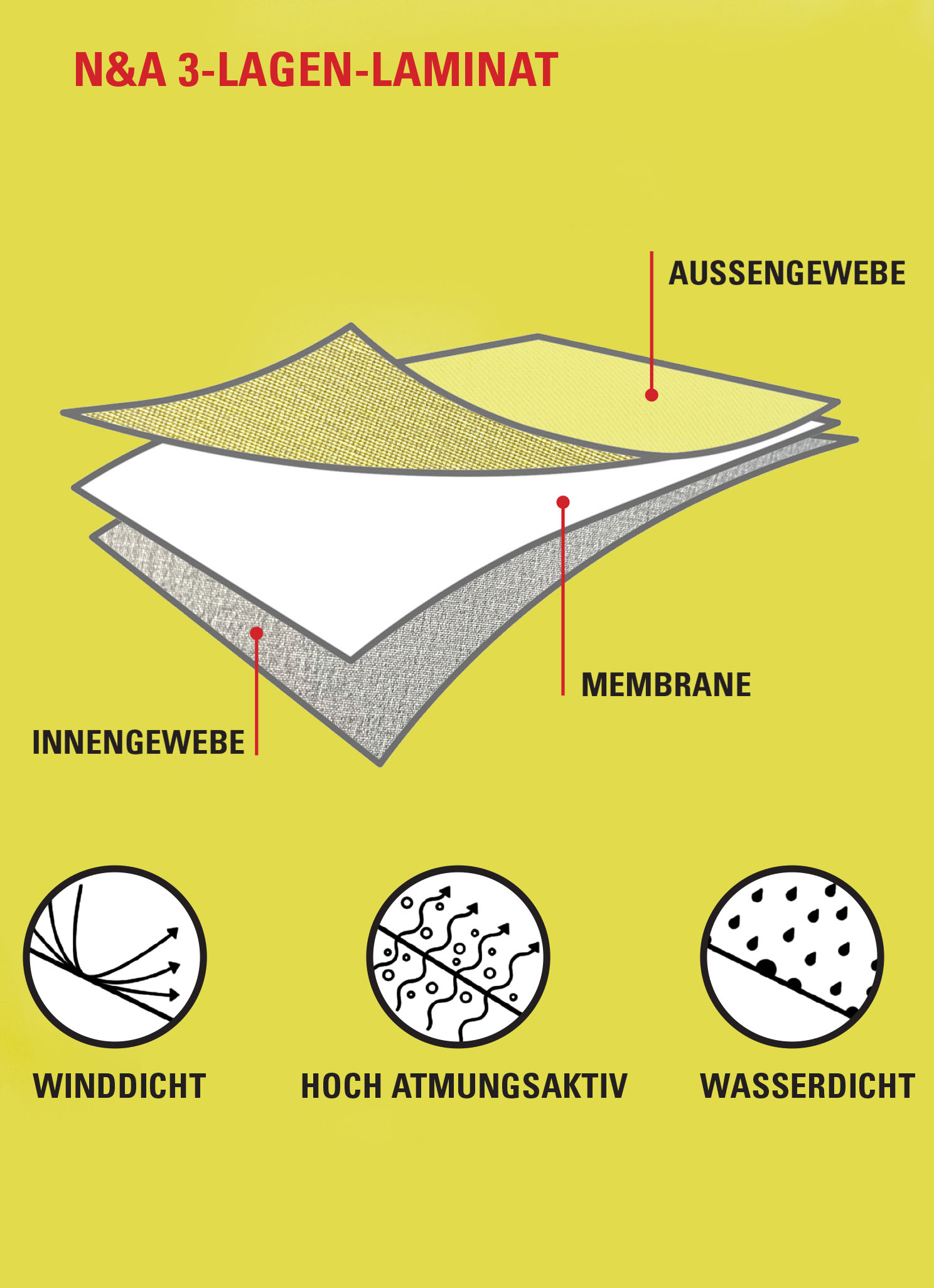 HOCHELASTISCHES 3-LAGEN LAMINAT aus 68% Polyester, 18% Polyurethan, 14% Polyamid, Hochwertige PU-Membrane zwischen Aussen- und Innengewebe