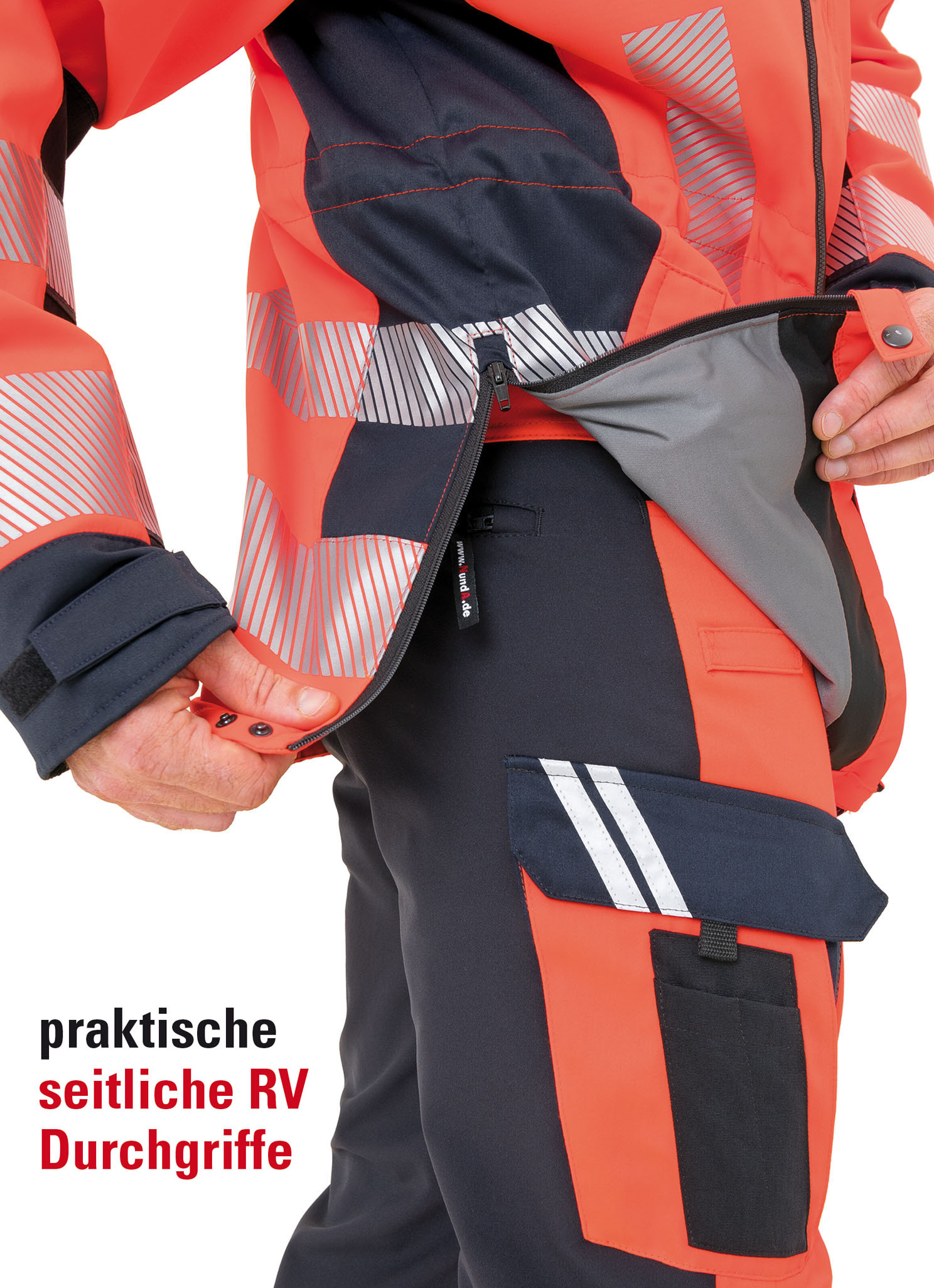 Warnschutz: EN 20471 Klasse 3 (Größe kleiner S dann Klasse 2 – mit Einsatzhose Klasse 1 als Anzug dann Klasse 3 in allen Größen)