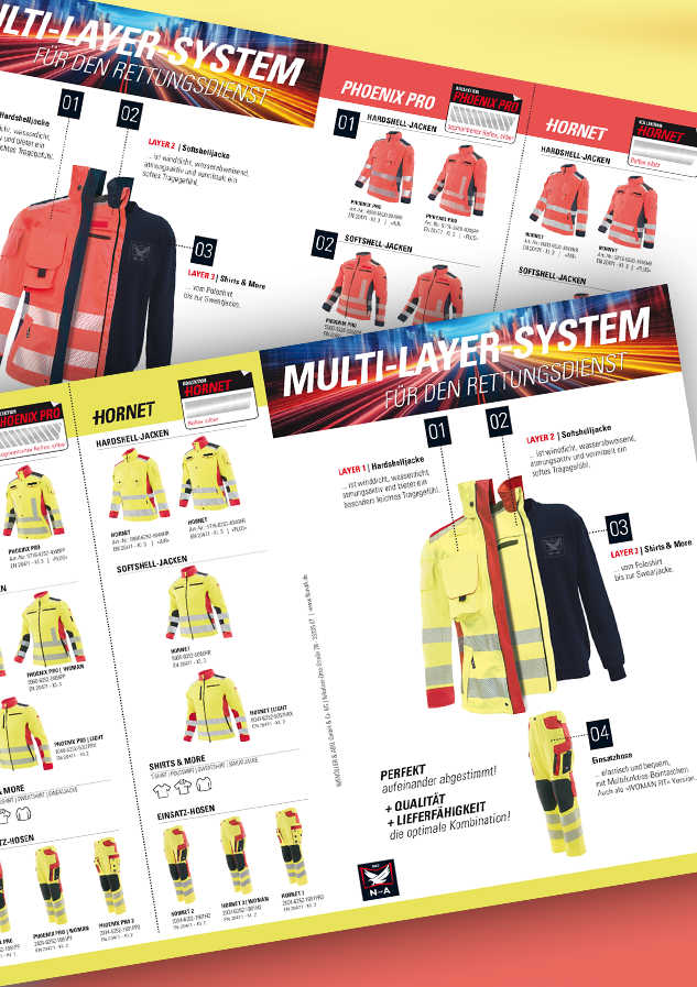 Der Flyer zeigt das komplette N&A Multi-Layer-System. Von den Shirts bis zur Hardshelljacke, Softshelljacke und Einsatzhose aus unserer PHOENIX PRO und HORNET Kollektion.